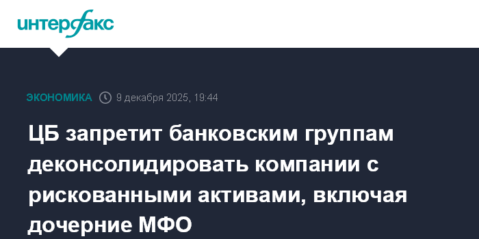 Москва. 9 декабря. INTERFAX.RU - ЦБ РФ в 2027 году планирует запретить банковским группам деконсолидировать компании с рискованными активами, в том числе дочерние микрофинансовые организации (МФО), говорится в информационном материале ЦБ "Обзор банковского регулирования".