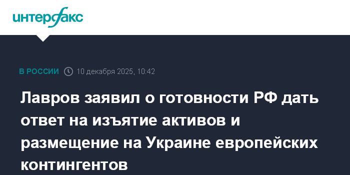 Москва. 10 декабря. INTERFAX.RU - Москва готова ответить на возможное размещение европейских контингентов на Украине и экспроприацию российских активов, заявил глава МИД РФ Сергей Лавров.