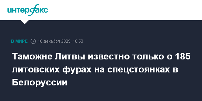 Москва. 10 декабря. INTERFAX.RU - На спецстоянках в Белоруссии сейчас находится 185 литовских грузовиков и прицепов, что значительно меньше того, о чем заявляют представители транспортной отрасли, заявил таможенный департамент при Минфине Литвы. Об этом сообщает LRT.