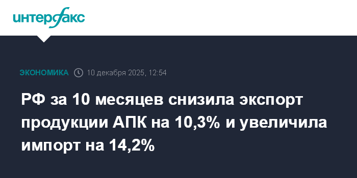 РФ за 10 месяцев снизила экспорт продукции АПК на 10,3% и увеличила импорт на 14,2%