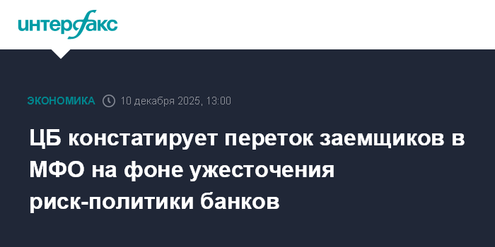 Москва. 10 декабря. INTERFAX.RU - ЦБ РФ наблюдает "некоторый переток" заемщиков в микрофинансовые организации (МФО) на фоне снижения кредитного качества потребительских кредитов и ужесточения банками требований к клиентам, в отдельных случаях это может приводить к росту их закредитованности.