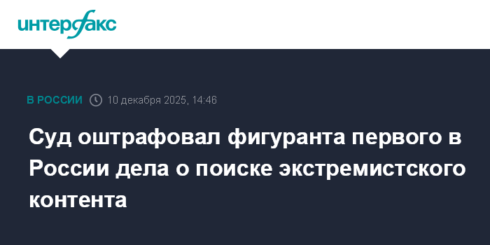 Москва. 10 декабря. INTERFAX.RU - Мировой судья судебного участка № 2 Красногорского судебного района города Каменска-Уральского в Свердловской области назначил 20-летнему местному жителю штраф по первому в России делу о поиске экстремистского контента, сообщает корреспондент "Интерфакса".