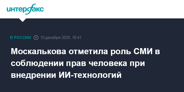 Москва. 10 декабря. INTERFAX.RU - Внедрение цифровых технологий, в том числе искусственного интеллекта (ИИ), должно происходить при четком соблюдении прав и свобод человека, а СМИ в этом процессе играют одну из главных ролей, заявила уполномоченный по правам человека в РФ Татьяна Москалькова.