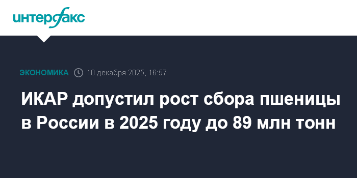 Москва. 10 декабря. INTERFAX.RU - Оценка сбора пшеницы в России в 2025 году может увеличиться до 89 млн тонн, заявил на конференции "Агрохолдинги России - 2025" директор Института конъюнктуры аграрного рынка (ИКАР) Дмитрий Рылько.