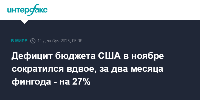 Дефицит бюджета США в ноябре сократился вдвое, за два месяца фингода - на 27%