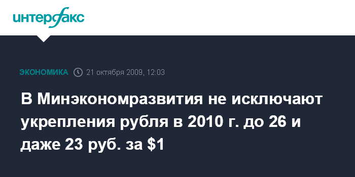 Москва. 21 октября. INTERFAX.RU – В Минэкономразвития не исключают существенного укрепления рубля до 26 и даже 23 рублей за доллар в 2010 г. в случае высоких цен на нефть и большого притока капитала в страну, заявил журналистам замглавы Минэкономразвития РФ Андрей Клепач в среду в Москве.