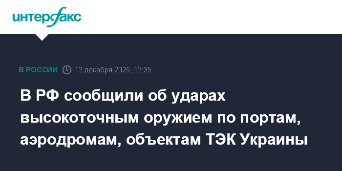 Москва. 12 декабря. INTERFAX.RU - Российские военные сообщили, что с 6 по 12 декабря нанесены массированный и пять групповых ударов по объектам на Украине, был применен комплекс "Кинжал".