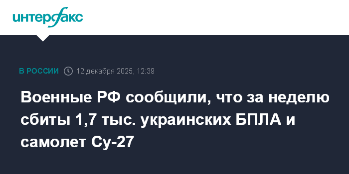 Москва. 12 декабря. INTERFAX.RU - Российские военные за неделю сбили свыше 1,7 тыс. украинских беспилотников, истребитель Су-27 и пять крылатых ракет "Нептун", заявили в Минобороны РФ в пятницу.