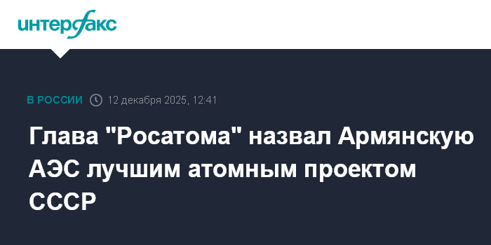 Москва. 12 декабря. INTERFAX.RU - Глава "Росатома" Алексей Лихачев назвал Армянскую АЭС, пережившую крупнейшее землетрясение, лучшим атомным проектом Советского Союза.