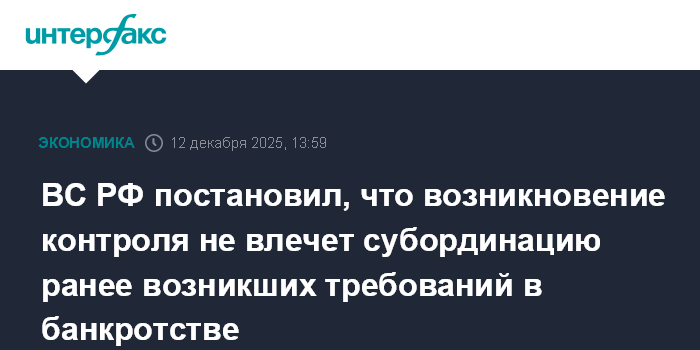 ВС РФ постановил, что возникновение контроля не влечет субординацию ранее возникших требований в банкротстве