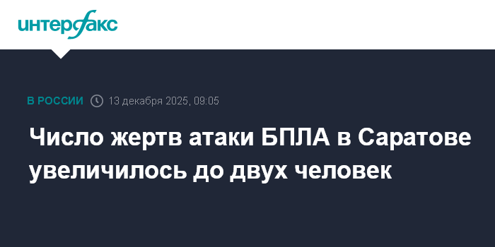 Москва. 13 декабря. INTERFAX.RU - Два человека погибли в результате атаки беспилотников в Саратове, сообщил губернатор Саратовской области Роман Бусаргин в своем телеграм-канале.