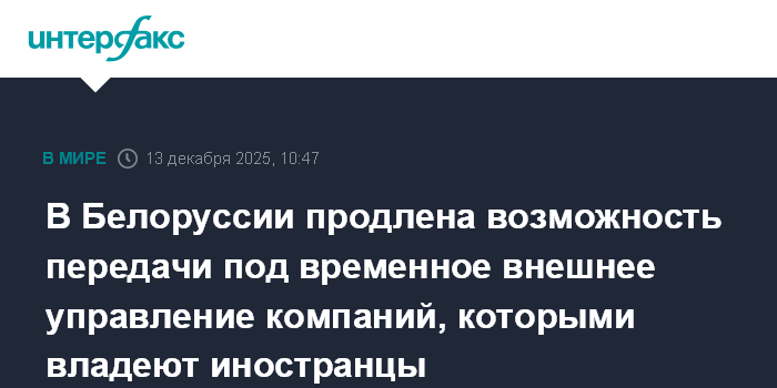 Москва. 13 декабря. INTERFAX.RU - Президент Белоруссии Александр Лукашенко подписал закон, продлевающий возможность передачи под временное внешнее управление коммерческих организаций, собственниками имущества которых являются лица из иностранных государств.