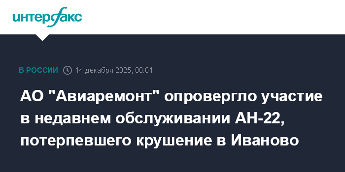 АО "Авиаремонт" опровергло участие в недавнем обслуживании АН-22, потерпевшего крушение в Иваново