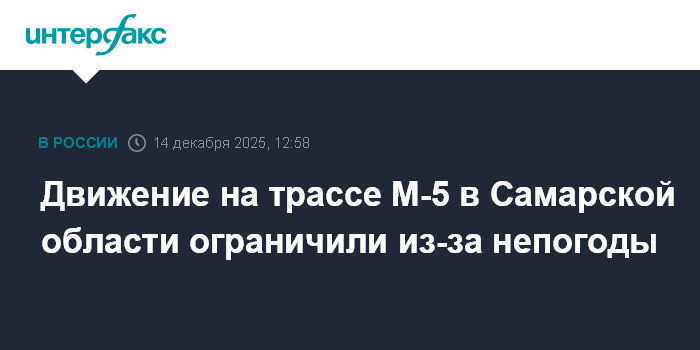 "14 декабря с 12:00 (мск) в Самарской области временно ограничено движение маршрутных и грузовых транспортных средств на участке км 98 - км 129 М-5 "Урал" Москва - Рязань - Пенза - Самара - Уфа - Челябинск, подъезд к г. Оренбург", - говорится в сообщении.