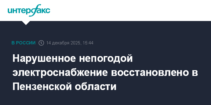 Москва. 14 декабря. INTERFAX.RU - Специалисты восстановили электроснабжение, нарушенное из-за непогоды в ряде населенных пунктов Пензенской области, сообщил губернатор региона Олег Мельниченко во воскресенье.