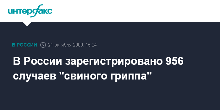 Москва. 21 октября. INTERFAX.RU - По последним данным, в России зарегистрировано 956 случаев заболеваний так называемым "свиным гриппом", из которых 60% имеют зарубежное происхождение, сообщила замглавы Минздравсоцразвития РФ Вероника Скворцова. "По России на сегодняшний день зарегистрировано 956 случаев, 60% - из них завозные, но 40% появились уже внутри страны", - заявила Скворцова в среду в прямом эфире радиостанции "Эхо Москвы".