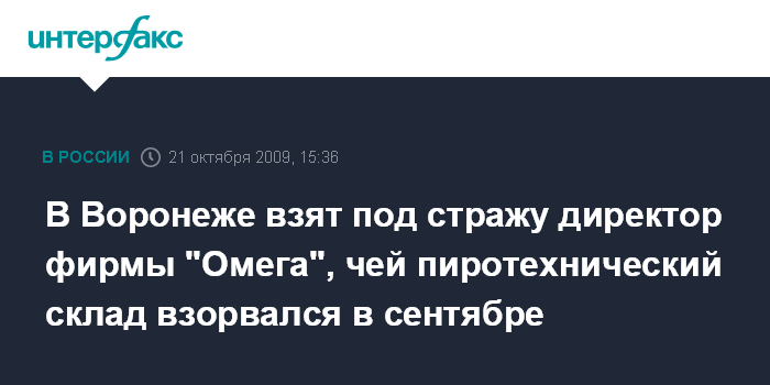 Москва. 21 октября. INTERFAX.RU - Директор воронежской фирмы "Омега", которому принадлежал взорвавшийся склад пиротехники, Алексей Рыжов взят под стражу, сообщил "Интерфаксу" в среду старший помощник руководителя регионального СУ СКП РФ Сергей Глазьев. По его словам, Рыжову предъявлено обвинение по ст. 218 УК РФ (нарушение правил учета, хранения и использования пиротехнических изделий, повлекшее по неосторожности смерть человека).