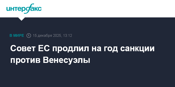 Москва. 15 декабря. INTERFAX.RU - Совет ЕС принял в понедельник решение продлить срок действия ограничительных мер в отношении Венесуэлы с учетом ситуации в этой стране еще на год, до 10 января 2027 года.