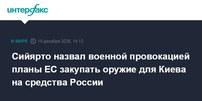 Москва. 15 декабря. INTERFAX.RU - Намерение Брюсселя направить 115 млрд евро за счет российских замороженных активов на вооружения для Украины является шагом к эскалации и военной провокацией, заявил в соцсети глава МИД Венгрии Петер Сийярто.