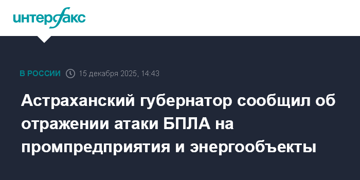 Москва. 15 декабря. INTERFAX.RU - В Астраханской области беспилотники атаковали промышленные и энергетические объекты, атака отражена, сообщил губернатор региона Игорь Бабушкин.