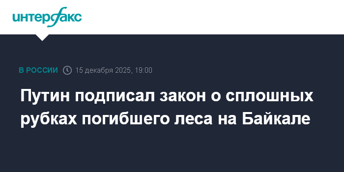 Москва. 15 декабря. INTERFAX.RU - Президент РФ Владимир Путин подписал закон, допускающий при определенных условиях сплошные рубки погибших лесных насаждений на Байкале.