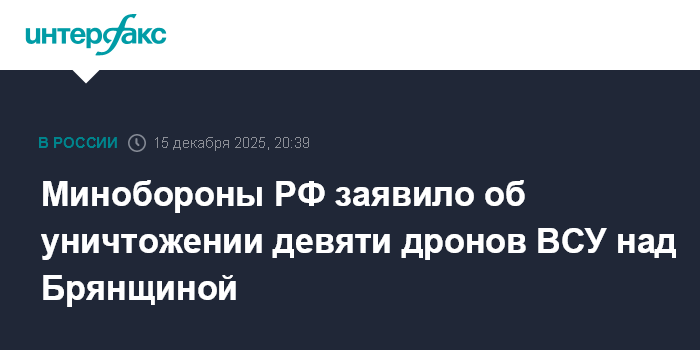 Москва. 15 декабря. INTERFAX.RU - Девять украинских беспилотников сбиты российскими военными в понедельник вечером над Брянской областью, сообщило Минобороны РФ.