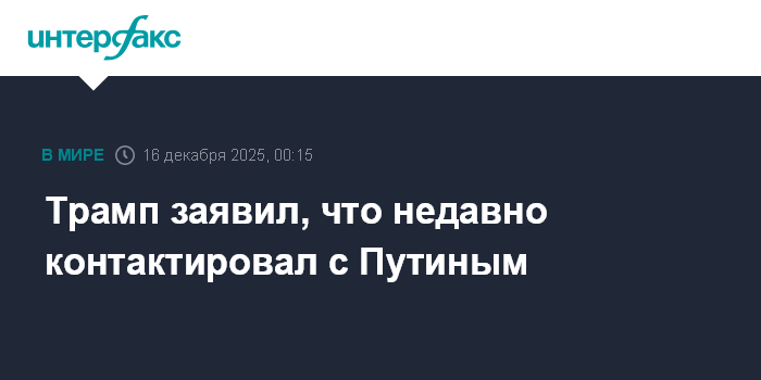 Москва. 16 декабря. INTERFAX.RU - Президент США Дональд Трамп заявил, что недавно контактировал с президентом РФ Владимиром Путиным.
