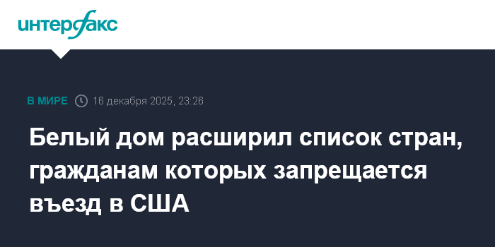 Москва. 16 декабря. INTERFAX.RU - Власти США расширили список стран, в отношении граждан которых действует полный запрет на въезд на американскую территорию, сообщает во вторник Белый дом.