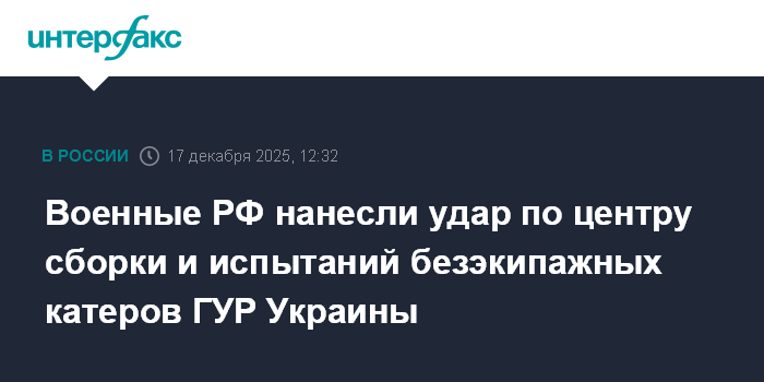 Москва. 17 декабря. INTERFAX.RU - Российские военные сообщили, что нанесены удары по центру сборки и испытаний безэкипажных катеров Главного управления разведки (ГУР) Украины, а также по объектам транспортной инфраструктуры, задействованных в интересах ВСУ.
