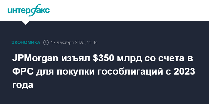 Москва. 17 декабря. INTERFAX.RU - Крупнейший американский банк JPMorgan Chase & Co. с 2023 года изъял со своего счета в Федеральной резервной системе почти $350 млрд и вложил основную часть этих средств в гособлигации США для того, чтобы защититься от снижения процентных ставок, которое угрожает подорвать его прибыль, сообщает Financial Times.