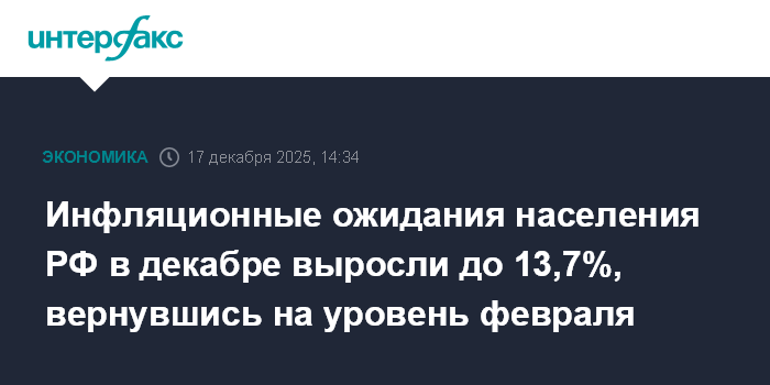 Инфляционные ожидания населения РФ в декабре выросли до 13,7%, вернувшись на уровень февраля