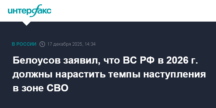 Белоусов заявил, что ВС РФ в 2026 г. должны нарастить темпы наступления в зоне СВО