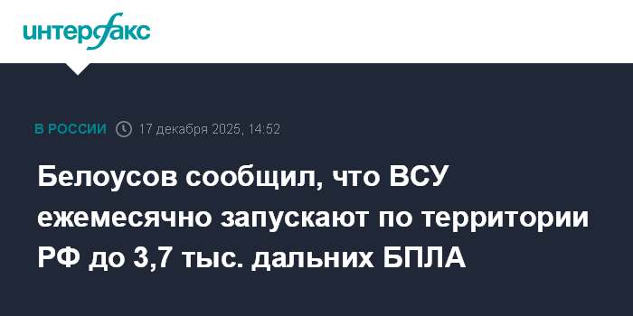 Москва. 17 декабря. INTERFAX.RU - Украина нарастила число атак дальними беспилотными летательными аппаратами вглубь территории РФ, заявил министр обороны России Андрей Белоусов.