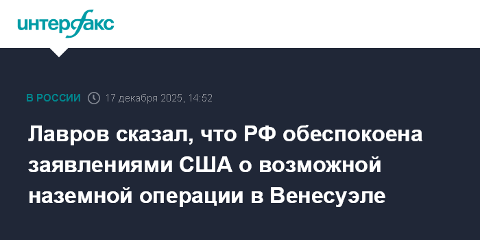Москва. 17 декабря. INTERFAX.RU - Заявления США о возможной наземной операции в Венесуэле в дополнение к действиям военно-морских сил в Карибском бассейне вызывают обеспокоенность, заявил министр иностранных дел России Сергей Лавров.