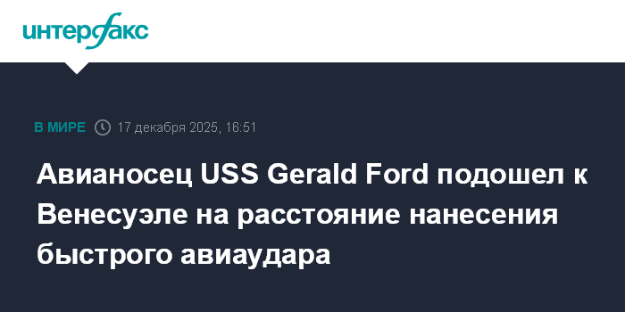 Москва. 17 декабря. INTERFAX.RU - Американский авианосец USS Gerald Ford, находящийся в Карибском море, приблизился к Венесуэле на расстояние, позволяющее нанести быстрый авиаудар, сообщило издание Military Watch Magazine.