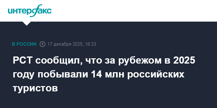 Москва. 17 декабря. INTERFAX.RU - Порядка 14 млн российских туристов отдохнут за рубежом по итогам 2025 года, это на 14% больше, чем годом ранее, сообщил вице-президент Российского союза туриндустрии (РСТ) Дмитрий Горин.