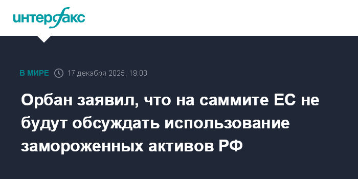 Москва. 17 декабря. INTERFAX.RU - Премьер-министр Венгрии Виктор Орбан выступил в среду с утверждением, что вопрос об использовании замороженных активов РФ для помощи Украине сняли с повестки дня начинающегося в четверг саммита ЕС.