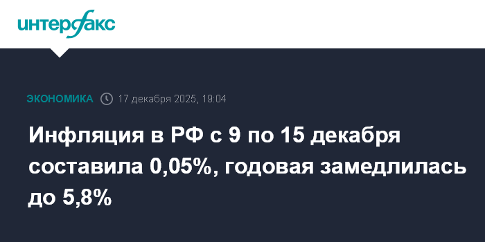 Инфляция в РФ с 9 по 15 декабря составила 0,05%, годовая замедлилась до 5,8%