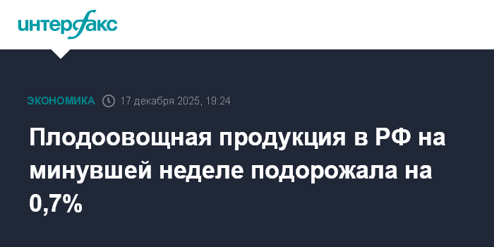 Москва. 17 декабря. INTERFAX.RU - Цены на плодоовощную продукцию в РФ, снизившиеся в начале декабря на 0,1%, на второй неделе месяца не удержали этот тренд и выросли на 0,7%.