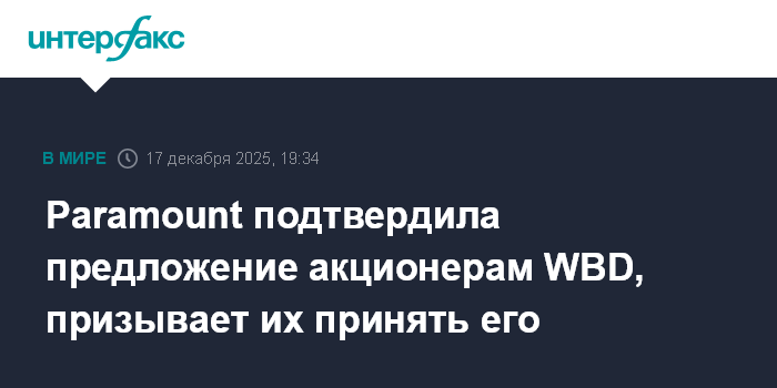 Москва. 17 декабря. INTERFAX.RU - Paramount Skydance Corp. подтвердила свое предложение акционерам Warner Bros. Discovery (WBD) о выкупе их акций по цене $30 за бумагу.
