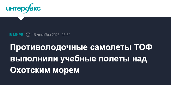 Москва. 18 декабря. INTERFAX.RU - Экипажи двух дальних противолодочных самолетов Ту-142МЗ Тихоокеанского флота провели плановые учебно-тренировочные полеты, в ходе которых отработали противолодочные задачи над акваторией Охотского моря и в проливных зонах, сообщила пресс-служба флота в четверг.