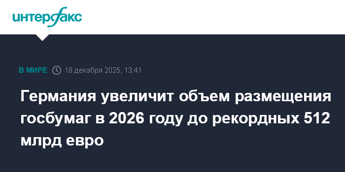 Москва. 18 декабря. INTERFAX.RU - Германия увеличит объем размещения госбумаг в 2026 году до рекордных 512 млрд евро, чтобы привлечь средства для финансирования масштабных расходов на инфраструктуру и оборону.