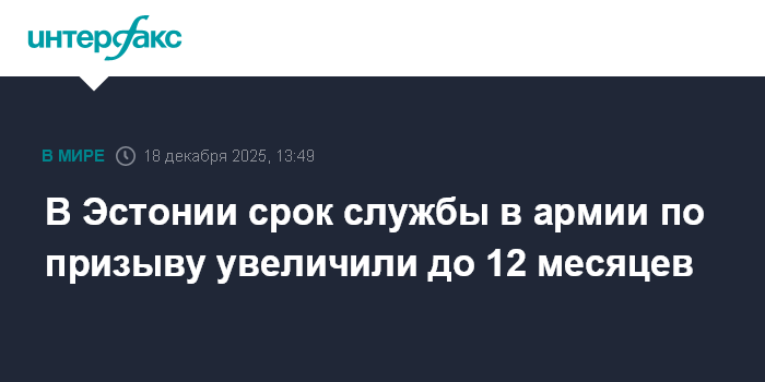 Москва. 18 декабря. INTERFAX.RU - Правительство Эстонии утвердило решение увеличить срок службы до 12 месяцев для всех призывников. До сих пор призывники, в зависимости от специальности, служили по 8 или 11 месяцев.