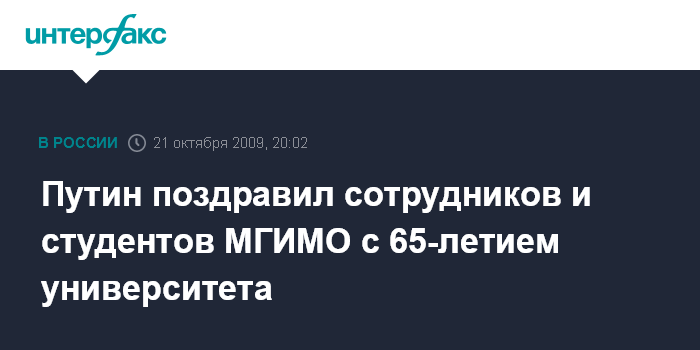 Москва. 21 октября. INTERFAX.RU - Председатель правительства России Владимир Путин направил поздравительную телеграмму профессорско-преподавательскому составу, сотрудникам, студентам и выпускникам МГИМО (Университета) МИД России в связи с 65-летием со дня его основания.
