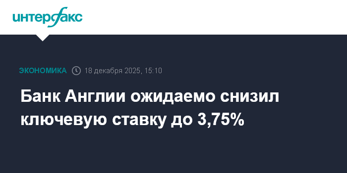 Москва. 18 декабря. INTERFAX.RU - Банк Англии снизил ключевую процентную ставку на 25 базисных пунктов, до 3,75% годовых, говорится в сообщении британского ЦБ.