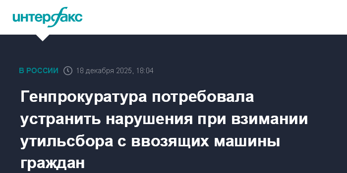 Москва. 18 декабря. INTERFAX.RU - Генпрокуратура РФ внесла представление главе Федеральной таможенной службы (ФТС) для устранения нарушений при взимании утилизационного сбора с граждан, ввозящих в страну автомобили.