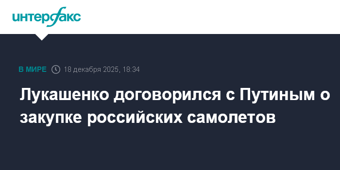 Москва. 18 декабря. INTERFAX.RU - Белорусская сторона договорилась с руководством России о покупке российских самолетов, заявил президент Белоруссии Александр Лукашенко, выступая на Всебелорусском народном собрании. Он рассказал детали переговоров с США об отмене санкций с авиакомпании "Белавиа".