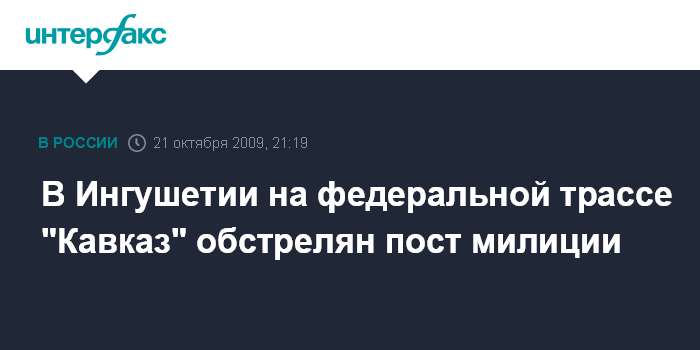 Назрань. 21 октября. INTERFAX.RU - На федеральной трассе "Кавказ" в районе селения Яндаре Назрановского района Ингушетии неизвестными лицами из стрелкового оружия и гранатомета обстрелян пост ДПС.