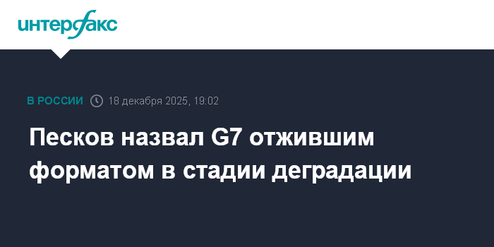 Москва. 18 декабря. INTERFAX.RU - Россия по-прежнему не заинтересована в воссоединении с G7, это отживший формат в стадии деградации, заявил телеканалу "Россия 24" пресс-секретарь президента Дмитрий Песков.