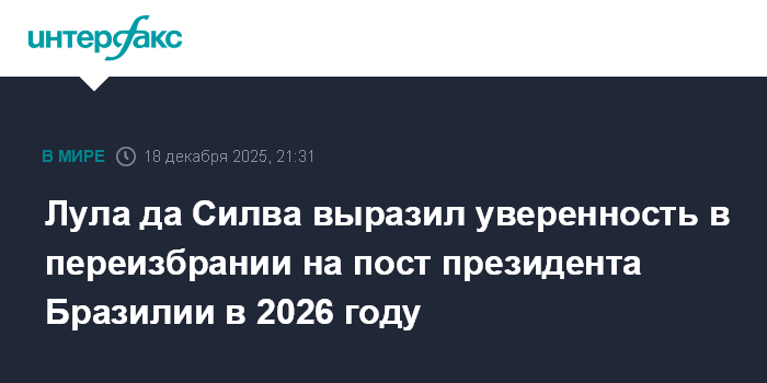 Москва. 18 декабря. INTERFAX.RU - Президент Бразилии Луис Инасиу Лула да Силва в четверг выразил уверенность, что одержит победу на выборах главы государства в следующем году, сообщает агентство ЭФЭ.